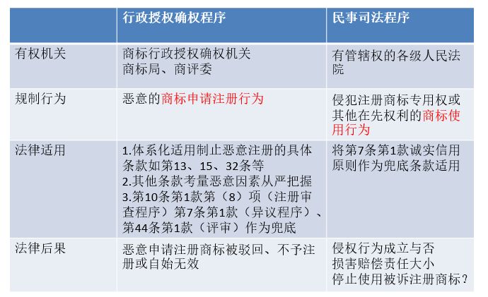 通过刚才的一些介绍,我做了一个对比。针对规制恶意注册问题,实际上有管辖权的机关就是商标局和商评委。规制行为,行政程序主要是商标申请时的恶意注册行为;民事程序当中侧重于商标使用行为。注册商标和使用商标之间是注册商标的权属纠纷,实际上应该向有关的行政机关提起相关的程序予以管辖,注册商标和注册商标不存在民事侵权问题。法律适用上,打击恶意注册的法律适用,无论是异议程序还是在无效宣告程序当中,都有相关的法律依据,法院的民事司法程序当中,目前对于恶意诉讼行为基本上以诚实信用原则作为条款适用。在法律后果方面,行政程序中宣告恶意申请注册商标不予注册或者宣告无效、驳回,在民事司法程序当中针对恶意诉讼的情况下,有的是认定善意的一方侵权行为不成立,有的是认定善意的一方即被诉方是侵权成立,但是没有损害赔偿责任。当事人是以其他在先权利提起注册商标侵权民事诉讼的话,可以在判决当中判定停止使用被诉注册商标,为什么在此打一个问号呢?就是商标注册专用权,使用权是最基本的内容,如果判决停止注册商标的使用,相当于从实质上否定了注商标的注册效力。